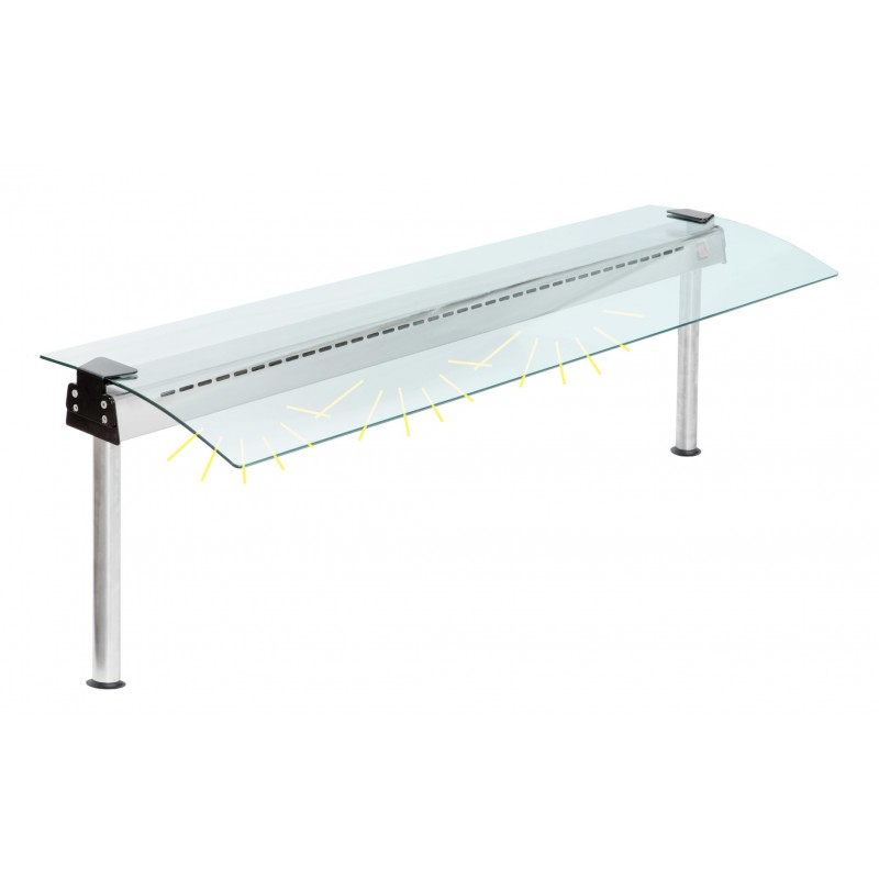 Suport inox, sticla cu o parte curbata, potrivita pentru elementele instalate ca sisteme de autoservire, lampa fluoresenta integrata pentru imbunatatirea vizibilitatii produselor, intrerupator ON/OFF pentru lumina, dimensiuni 1097x552x480mm, capacitate 3 GN 1/1, alimentare 230V, putere 14W, tara de origine Spania.