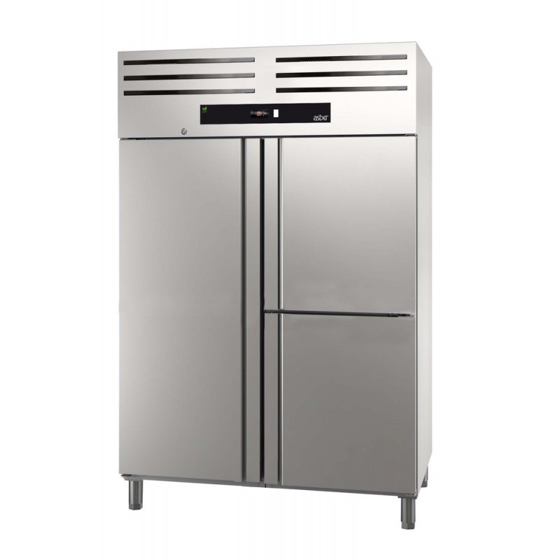 Corp inox, 3 usi(1 + 2 x 1/2), picioare ajustabile, grosime izolatie 60mm, control digital al temperaturii, intrerupator iluminat Start/Stop, garnitura magnetica detasabila pentru curatare usoara, refrigerare cu gaz ecologic R290, dezghetare automata, motor in partea superioara, putere 1251W, consum anual 4855 kWh, capacitate 1186L, temperatura cuprinsa intre -16⁰C si -21⁰C, alimentare 230V, dimensiune 1318x842x2040mm, clasa energetica E, tara de origine Spania.