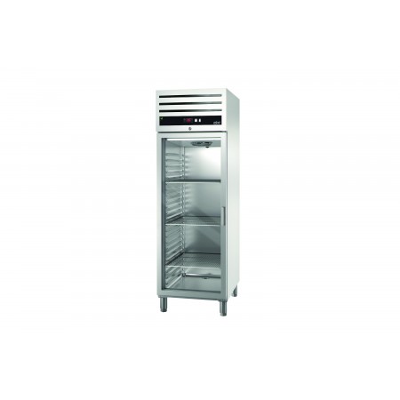 Corp inox, dimensiune 653 x 837 x 2040mm, capacitate 543 litri, putere 0. 355 kw, tensiune de alimentare: 230 V 1+N – 50 Hz, consum anual 2336 kWh, clasa energetica D, Green line, Fabricat special din otel inoxidabil de inalta calitate, ideal pentru aplicatii profesionale intensive, cu un design robust si finisaje perfecte. Izolatia are o grosime de 60 mm, realizata din poliuretan de inalta densitate (40 kg/m³), fara CFC, injectata sub presiune ridicata. Usile din otel inoxidabil sunt echipate cu manere ergonomice, integrate pe toata lungimea, care asigura o deschidere practica si previn acumularea de praf sau murdarie. Usile articulate au revenire automata pentru o inchidere perfecta, reducand pierderile de temperatura. Ele pot ramane deschise la un unghi de 120° si se inchid automat la mai putin de 90°. Balamalele usilor sunt reversibile, permitand adaptarea pe loc a dispozitivului. Modelele cu usi complete sunt dotate cu sistem de blocare. Controlul digital intuitiv permite ajustarea rapida si usoara a parametrilor de temperatura. Dispozitivul are un buton luminos start-stop pentru utilizare facila. Grila de ventilatie de pe panoul frontal mentine sistemul de racire bine ventilat, pentru o functionare mai eficienta. Evaporatorul cu flux fortat are un strat de protectie impotriva coroziunii. Sistemul inteligent de circulatie a aerului asigura o consistenta perfecta a temperaturii, datorita unui design inovator al fluxului de aer. Intrerupatorul usii opreste ventilatorul atunci cand usa este deschisa, prevenind pierderea aerului rece si economisind energie. Apa rezultata din dezghetare este evaporata automat cu ajutorul gazului fierbinte din compresor, fara a fi necesare elemente de incalzire, ceea ce reduce consumul de energie. Picioarele ajustabile din otel inoxidabil permit modificarea individuala a inaltimii (130 mm - 200 mm) pentru a facilita curatarea. Optional, se pot adauga pedale de actionare si role. Ghidajele stantate cu margini rotunjite simplifica operatiunile de curatare si permit plasarea facila a grilajelor. Grilajele din sarma acoperita cu plastic pot sustine pana la 40 kg, fiind ideale pentru diferite tipuri de ambalaje. Garnitura magnetica detasabila asigura igiena maxima si mentine proprietatile de izolare. Panoul inferior stantat, cu scurgere de apa, este proiectat pentru curatare rapida si eficienta, asigurand un nivel optim de igiena. Interiorul cu margini rotunjite faciliteaza curatarea si reduce acumularea de murdarie. Cabinetul ofera 23 de pozitii pentru grilaje, cu o distanta de 55 mm intre ele in versiunea cu usa completa, si 10 pozitii cu aceeasi distanta in versiunea cu jumatate de usa. Este compatibil cu containere GN 2/1 sau 2 x GN 1/1 si este echipat cu 3 grilaje GN 2/1 pentru fiecare usa completa. Refrigerantul utilizat este R290 Hydrocarbon (HC), ecologic si eficient. Aparatul functioneaza la o temperatura de lucru intre -17 °C si -21 °C, in conditii de climat Clasa IV. tara de origine Spania.