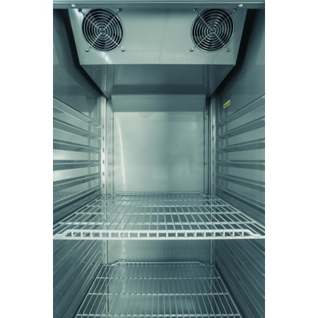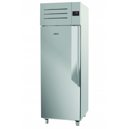 Corp inox, dimensiune 693 x 875 x 2119 mm, capacitate 610 litri, putere 0.525 kw, tensiune de alimentare: 230 V 1+N – 50 Hz, consum anual 2231 kwh,clasa energetica D, Fabricat special din otel inoxidabil de inalta calitate pentru aplicatii profesionale intensive, acest echipament prezinta un design foarte robust si finisaje perfecte. Izolatia din poliuretan cu grosimea de 80 mm, fara CFC, cu densitate mare (40 kg/m³), este injectata sub presiune ridicata. Usa este complet realizata din otel inoxidabil, cu maner integrat si finisaje excelente. Usi articulate cu revenire automata pentru o inchidere perfecta, care minimizeaza cresterea temperaturii. Ușile au o pozitie de blocare la 120° si se inchid automat la mai putin de 90°. Balamalele usilor sunt reversibile, permitand adaptarea cabinetului la locul de instalare. Modelele cu usa completa sunt echipate cu incuietoare.Controller cu ecran tactil de dimensiuni mari, cu parametri usor ajustabili, mod de economisire a energiei si sistem de alarma HACCP. Iluminare interioara cu LED pentru consum redus de energie, care evidentiaza interiorul cabinetului. Evaporator cu ventilatie fortata si acoperire anti-coroziva. Sistemul inteligent de circulatie a aerului asigura o consistenta perfecta a temperaturii datorita designului inovator al fluxului de aer. Intrerupatorul de la usa opreste ventilatorul atunci cand usa este deschisa, evitand iesirea aerului rece si economisind energie. Sistemul de dezghetare cu gaz fierbinte utilizeaza gazul fierbinte provenit de la compresor, reducand timpul de dezghetare la jumatate si eliminand necesitatea unui element de incalzire. Apa rezultata din dezghetare este evaporata automat, tot prin gazul fierbinte provenit de la compresor, reducand consumul de energie.Picioarele din otel inoxidabil sunt reglabile pe inaltime (95 mm – 115 mm), permitand o curatare convenabila. Pedala si rotile sunt disponibile optional. Ghidajele embosate cu margini rotunjite permit operatiuni de curatare mai convenabile. Plasarea si reglarea grilajelor sunt mai simple ca niciodata. Grilajele din sarma acoperite cu plastic permit depozitarea diferitelor tipuri de ambalaje si au o capacitate maxima de incarcare de pana la 40 kg. Garnitura magnetica detasabila a usii asigura igiena maxima si mentine proprietatile izolante. Panoul inferior embosat, cu scurgere de apa, este special conceput pentru a facilita curatarea rapida si usoara. Interiorul cu margini rotunjite reduce potentialele zone de acumulare a murdariei si faciliteaza curatarea.Echipamentul ofera 24 de pozitii pentru grilaje, crescand capacitatea de incarcare, cu o distanta de 55 mm intre ele. Compatibil cu containere alimentare GN 2/1 sau 2 x GN 1/1, este echipat cu trei grilaje GN 2/1 pentru fiecare usa completa. Utilizeaza agent frigorific R290 (HC). Temperatura de lucru este intre -18 ºC si -22 ºC in conditii climatice de clasa V. Tensiunea de alimentare: 230 V 1+N – 50 Hz. tara de origine Spania.