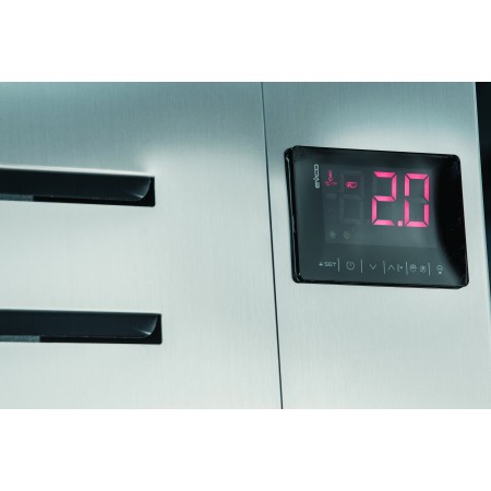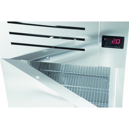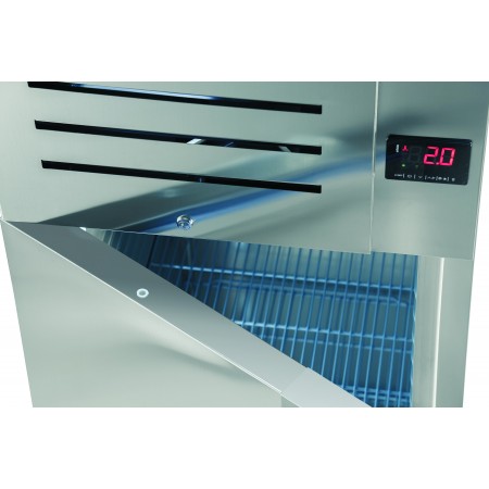 Corp inox, dimensiune 1358 x 875 x 2119mm, capacitate 1332 litri, putere 0.761 kw, tensiune de alimentare: 230 V 1+N – 50 Hz, consum anual 4482 kwh,clasa energetica D.Fabricat special din otel inoxidabil de inalta calitate pentru aplicatii profesionale intensive, acest echipament se remarca printr-un design foarte robust si finisaje perfecte. Izolatia din poliuretan cu grosimea de 80 mm, fara CFC, are o densitate mare de 40 kg/m³ si este injectata sub presiune ridicata. Usa este complet realizata din otel inoxidabil, cu maner integrat si finisaje excelente. Usi articulate cu revenire automata, care asigura o inchidere perfecta si minimizeaza cresterea temperaturii. Ușile au o pozitie de blocare la 120° si se inchid automat la mai putin de 90°. Balamalele usilor sunt reversibile, permitand adaptarea cabinetului la locul de instalare. Modelele cu usa completa sunt echipate cu incuietoare.Controllerul cu ecran tactil de dimensiuni mari permite ajustarea facila a parametrilor, include un mod de economisire a energiei si un sistem de alarma HACCP. Iluminarea interioara cu LED, cu consum redus de energie, evidentiaza interiorul cabinetului. Evaporatorul cu ventilatie fortata are o acoperire anti-coroziva. Sistemul inteligent de circulatie a aerului asigura o consistenta perfecta a temperaturii datorita designului inovator al fluxului de aer. Intrerupatorul de la usa opreste ventilatorul atunci cand usa este deschisa, prevenind pierderea aerului rece si economisind energie. Dezghetarea cu gaz fierbinte utilizeaza gazul provenit de la compresor, eliminand necesitatea unui element de incalzire, reducand astfel consumul de energie si timpul de dezghetare la jumatate. Apa rezultata din dezghetare este evaporata automat folosind acelasi sistem.Picioarele din otel inoxidabil sunt reglabile pe inaltime, intre 95 mm si 115 mm, permitand o curatare convenabila. Pedala si rotile sunt disponibile optional. Ghidajele embosate cu margini rotunjite faciliteaza operatiunile de curatare si permit ajustarea usoara a grilajelor. Grilajele din sarma acoperita cu plastic pot sustine diferite tipuri de ambalaje, avand o capacitate maxima de incarcare de 40 kg. Garnitura magnetica a usii, detasabila si usor de inlocuit, asigura un nivel maxim de igiena si pastreaza proprietatile izolante. Panoul inferior embosat, cu scurgere de apa integrata, faciliteaza curatarea rapida si usoara. Interiorul cu margini rotunjite elimina potentialele puncte de acumulare a murdariei.Echipamentul include 24 de pozitii pentru grilaje, cu o distanta de 55 mm intre ele, crescand capacitatea de incarcare. Este compatibil cu containere alimentare GN 2/1 sau 2 x GN 1/1 si este livrat cu trei grilaje GN 2/1 pentru fiecare usa completa. Utilizeaza agent frigorific R290 (HC). Temperatura de lucru variaza intre -18 ºC si -22 ºC in conditii climatice de clasa IV si V. Tensiunea de alimentare este de 230 V 1+N – 50 Hz. tara de origine Spania.