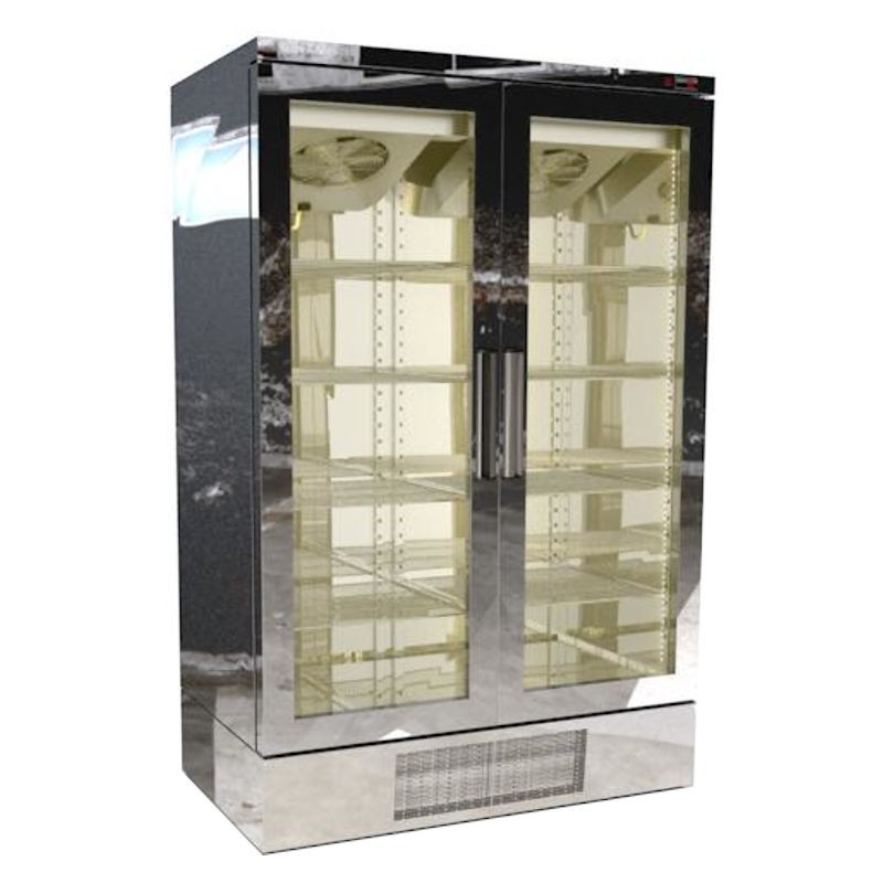 Corp inox, doua usi din sticla, interior proiectat pentru o curatare usoara, usi cu inchidere magnetica, izolatie din poliuretan fara CFC/HCFC - injectat la presiune mare, grosime izolatie 50mm, temperatura ambientala de 45C, dezghetare automata, termostat electronic, picioare ajustabile, volum 1162L, temperatura -18C -> -21C, putere 746W, greutate 240kg, dimensiune 1400x800x2210mm, tara de origine Grecia.