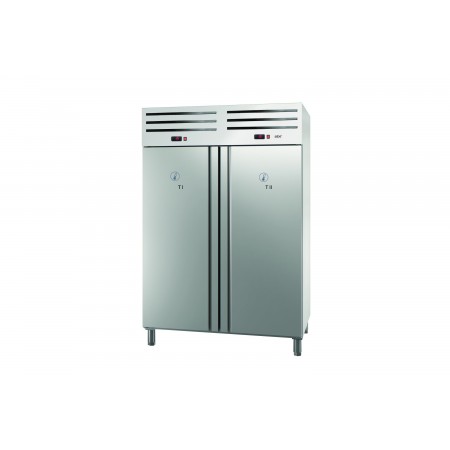 Corp inox, 2 usi( una pentru refrigerare, una pentru congelare), dezghetare automata, 2 compresoare (cate unul pentru fiecare compartiment) panou de control cu afisaj digital al temperaturii, temperatura cuprinsa intre 1⁰si 5⁰ pentru refrigerare, iar pentru congelare temperatura este cuprinsa intre -10⁰ si -20⁰, capacitate 910L putere 810W, dimensiune 1200x740x1955mm, tara de origine Spania