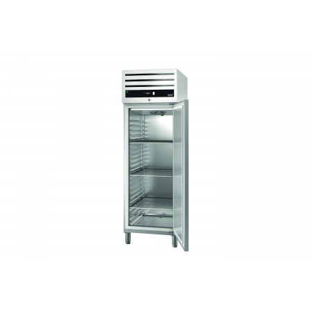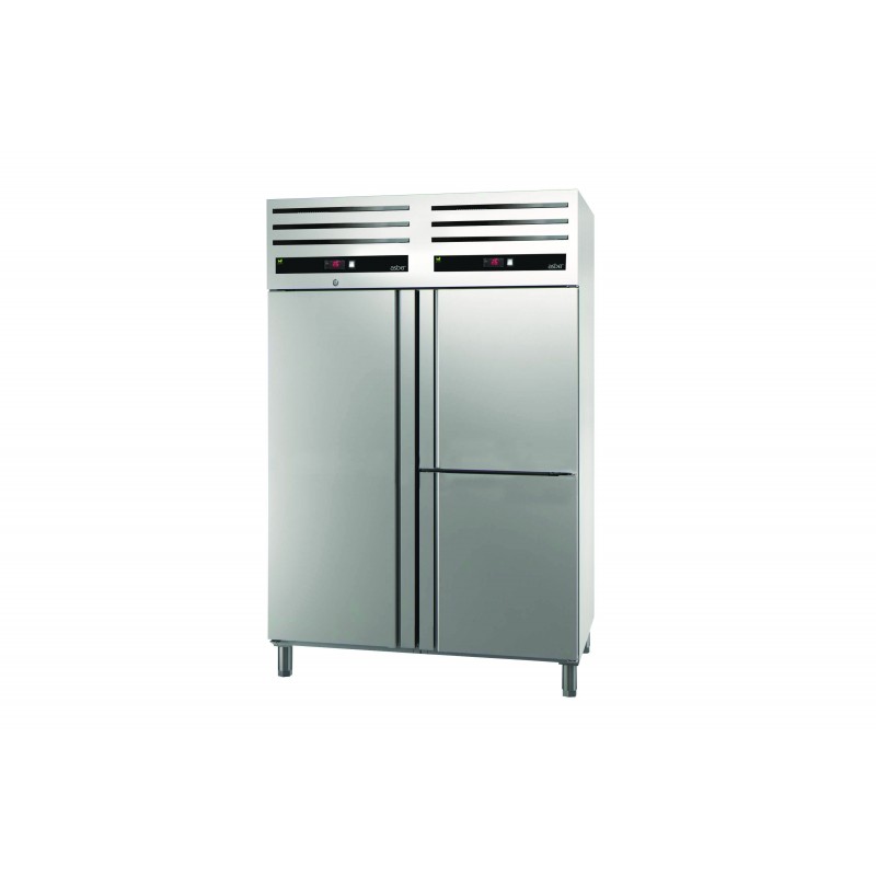 Corp inox, dimensiune 1318 x 837 x 2040 mm, capacitate 527 + 527 litri, putere 0.185 + 0.185 kw, tensiune de alimentare: 230 V 1+N – 50 Hz, consum anual 985 kWh, clasa energetica D, Green line , Fabricat special din otel inoxidabil de inalta calitate, ideal pentru aplicatii profesionale intensive, cu un design robust si finisaje perfecte. Echipamentul dispune de doua compartimente frigorifice independente, fiecare cu propriul sistem de compresor. Izolatia este realizata din poliuretan de inalta densitate (40 kg/m³), fara CFC, cu o grosime de 60 mm, injectata sub presiune ridicata. Usile din otel inoxidabil sunt dotate cu manere ergonomice integrate pe toata lungimea, care asigura deschiderea practica si previn acumularea de praf sau murdarie. Usile articulate au revenire automata pentru o inchidere perfecta, reducand pierderile de temperatura. Acestea raman deschise la un unghi de 120° si se inchid automat la mai putin de 90°. Balamalele usilor sunt reversibile, permitand adaptarea pe loc. Modelele cu usi complete sunt echipate cu sistem de blocare. Fiecare compartiment are un control digital intuitiv, care permite ajustarea rapida a parametrilor de temperatura, si un buton luminos start-stop pentru utilizare facila. Grila de ventilatie de pe panoul frontal mentine sistemul de racire bine ventilat pentru o eficienta sporita. Evaporatorul cu flux fortat are un strat de protectie impotriva coroziunii, iar sistemul inteligent de circulatie a aerului asigura consistenta perfecta a temperaturii. Intrerupatorul usii opreste ventilatorul atunci cand usa este deschisa, prevenind pierderile de aer rece si economisind energie. Apa rezultata din dezghetare este evaporata automat cu ajutorul gazului fierbinte provenit de la compresor, reducand consumul de energie si eliminand necesitatea elementelor de incalzire. Picioarele ajustabile din otel inoxidabil permit modificarea individuala a inaltimii (130 mm - 200 mm) pentru a facilita curatarea. Optional, se pot adauga pedale de actionare si role. Ghidajele detasabile simplifica curatarea, iar grilajele din sarma acoperite cu epoxi, pentru o protectie sporita, pot sustine pana la 40 kg. Garnitura magnetica detasabila asigura un nivel maxim de igiena si pastreaza proprietatile de izolare. Panoul inferior cu scurgere de apa este proiectat pentru curatare rapida, asigurand o igiena optima. Interiorul cu margini rotunjite faciliteaza curatarea si elimina zonele unde s-ar putea acumula murdaria. Cabinetul ofera 23 de pozitii pentru grilaje, cu o distanta de 55 mm intre ele. Este compatibil cu containere GN 2/1 sau 2 x GN 1/1 si este echipat cu 3 grilaje GN 2/1 pentru fiecare usa completa. Refrigerantul utilizat este R600a Hydrocarbon (HC), ecologic si eficient. Temperatura de lucru in compartimentul I este intre 0 °C si +8 °C, iar in compartimentul II intre +5 °C si +8 °C, in conditii de climat Clasa IV. tara de origine Spania.