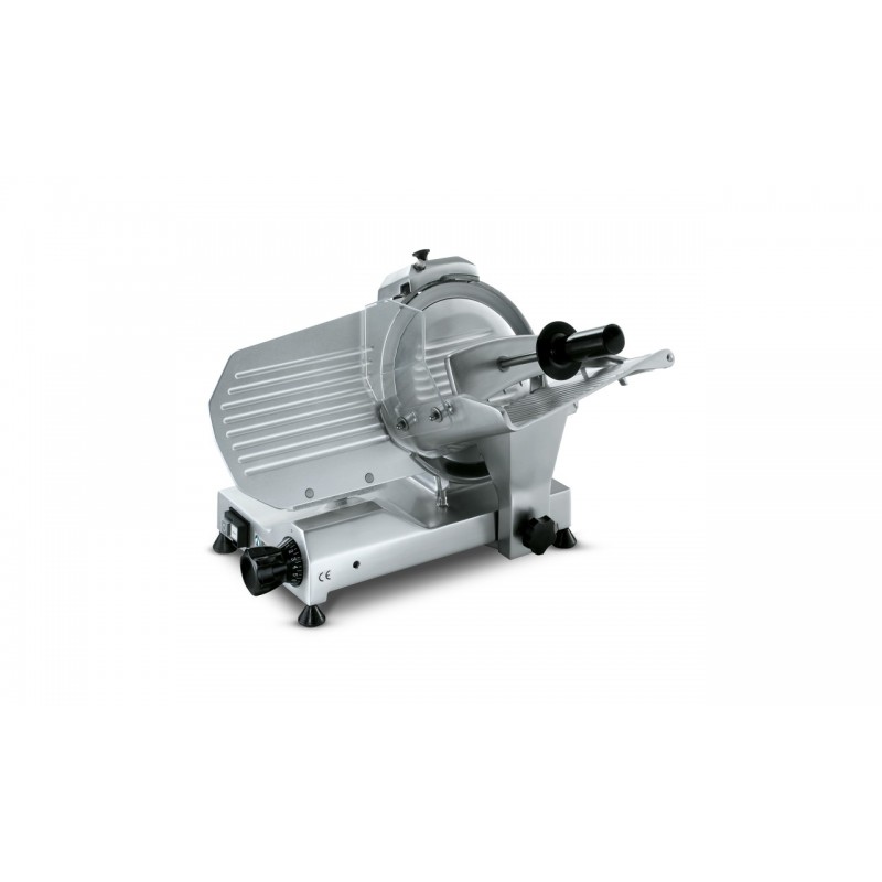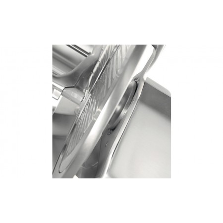 Corp inox, dimensiuni de 395 x 245 x 370 mm, putere 0.147 kw, lama 275 mm, grosimea taierii 13mm, tensiune de alimentare: 230v/50 Hz.Realizat din aliaj de aluminiu turnat anodizat.Distanta generoasa intre lama si motor pentru o curatare usoara.Motor ventilat.Lame forjate, calite, cu grosime mare.Caruciorul se deplaseaza pe bucse autolubrifiante si pini rectificati.Suruburi si deflector de felii din otel inoxidabil.Suport solid pentru reglarea grosimii.Ansamblu ascutitor turnat.Dimensiuni compacte si capacitate mare de taiere.Versiune profesionala CE, cu dispozitiv pentru eliberarea caruciorului.Lame acoperite cu teflon sau zimtate disponibile la cerere.Inclinatie lama 25°. tara de originie Italia.