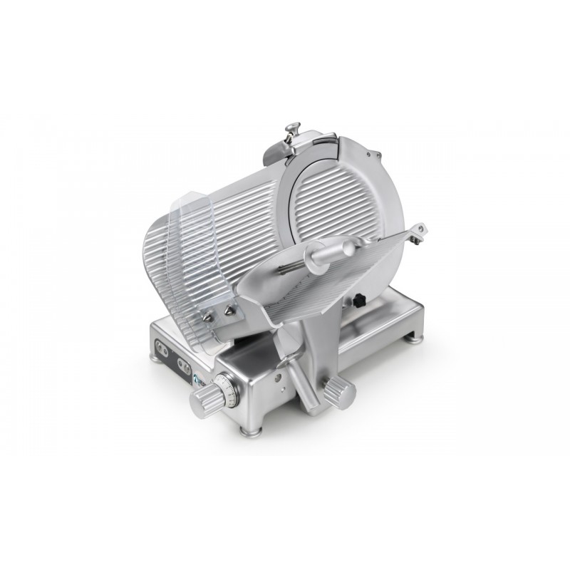Corp inox, dimensiuni de 513 x 340 x 480mm, putere 0.370kw/0.5 cp. lama 350 mm, grosimea taierii 23 mm, tensiune de alimentare: 230v/50 Hz.Design rotunjit, fara margini ascutite sau suruburi vizibile. Tija de glisare cromata si slefuita. Bucse autolubrifiante pentru tija de glisare. Opritoare din cauciuc vulcanizat pe carucior. Capac suport detasabil pentru placa de reglare a grosimii. Deflector de felii din otel inoxidabil. Scripete al lamei fara orificiu central, pentru o curatare mai usoara. Miscare reglabila a mesei de feliere in primii 3 mm de deschidere, pentru o precizie ridicata la taierea feliilor subtiri. Inel de siguranta pe axul mesei, pentru a preveni infiltrarea lichidelor in interiorul masinii. Capac al lamei usor detasabil. Suruburi si accesorii din otel inoxidabil. Scripete de transmisie inchis si etans. Distanta de 49,5 mm intre lama si motor. Capac inferior inclus. Circuit electronic de comutare 110-220V monofazat sau 220-280V trifazat. Dispozitiv de ascutire incorporat, cu protectie inferioara. Instrument standard pentru demontarea lamei. Inclinare a lamei de 35°. Buton din aluminiu. Picioare telescopice din aluminiu cu baza din cauciuc. Butoane din otel inoxidabil cu protectie IP67. Kit de intretinere inclus. tara de originie Italia.