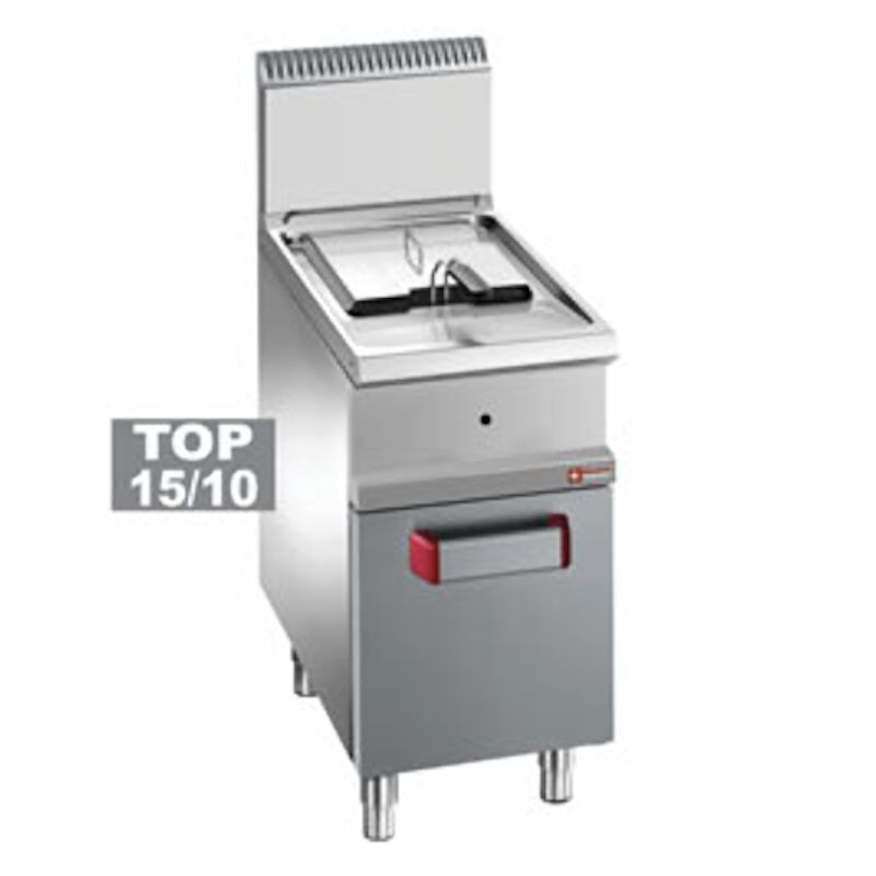 Corp inox, bazin cu zona rece si zona de decantare, dimensiune bazin 280x340x300mm, capacitate ulei minima 13L, capacitate ulei maxima 14L, cos dimensiune 260x295x120mm, robinet de scurgere in dulap neutru, arzatoare orizontale, termostat 90⁰-190⁰C, aprindere piezoelectrica, flacara de veghe, valva securitate, dimensiune 400x700x850mm, picioare ajustabile, tara de origine Italia