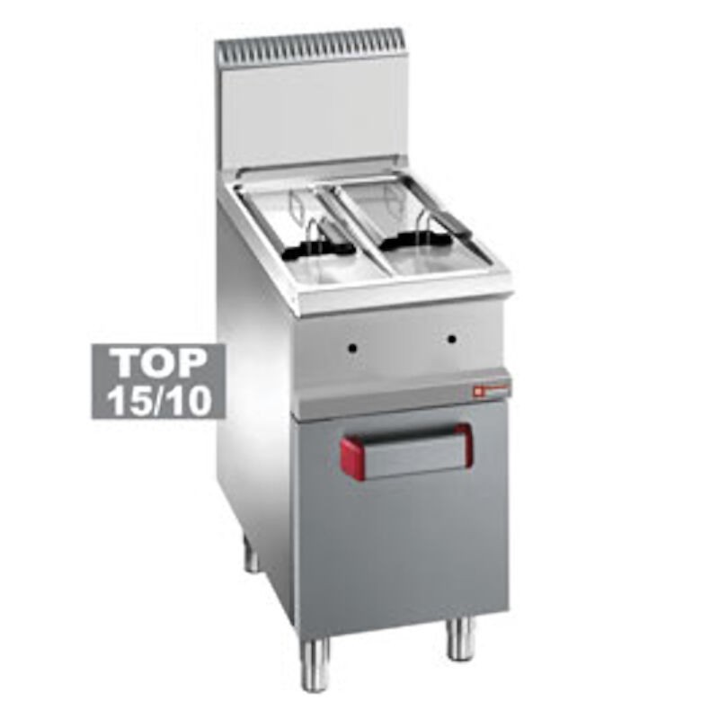 Corp inox, doua bazine de 7L, bazin cu zona rece si zona de decantare, dimensiune bazin 280x340x300mm, capacitate ulei minima 6L per bazin, capacitate ulei maxima 7L per bazin, cos dimensiune 120x295x120mm, robinet de scurgere in dulap neutru, arzatoare orizontale, termostat 90⁰-190⁰C, aprindere piezoelectrica, flacara de veghe, valva securitate, dimensiune 400x700x850mm, picioare ajustabile, tara de origine Italia