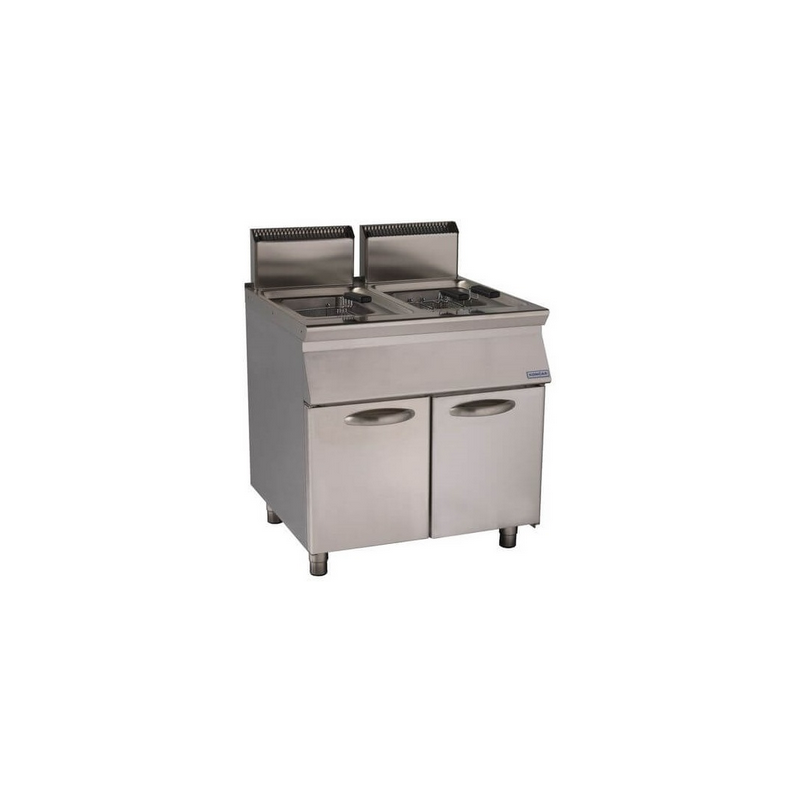 Corp inox cu dulap inchis, dimensiuni 800x730x875mm, putere 2x16.5kW, bazine cu zona rece si zona de decantare, dimensiuni bazin 220x350x260mm, filtru de ulei, flacara de veghe, termocupla, aprindere piezoelectrica, capacitate 2x17litri, dimensiuni cos 200x310x120mm, termostat 100⁰-195⁰C, limitator de temperatura 220⁰C, tara de origine Croatia.