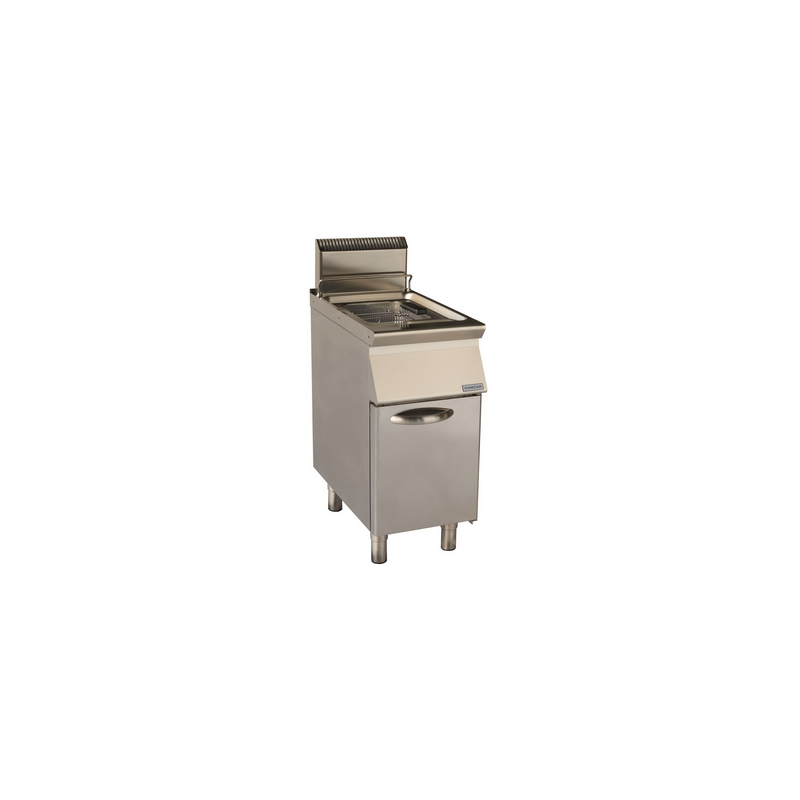 Corp inox cu dulap inchis, dimensiuni 400x930x875mm, putere 16.5kW, bazin cu zona rece si zona de decantare, dimensiuni bazin 300x420x245 mm, filtru de ulei, flacara de veghe, termocupla, aprindere piezoelectrica, capacitate 17 litri, dimensiuni cos 280x370x120 mm, termostat 100⁰-195⁰C, limitator de temperatura 220⁰C, tara de origine Croatia.