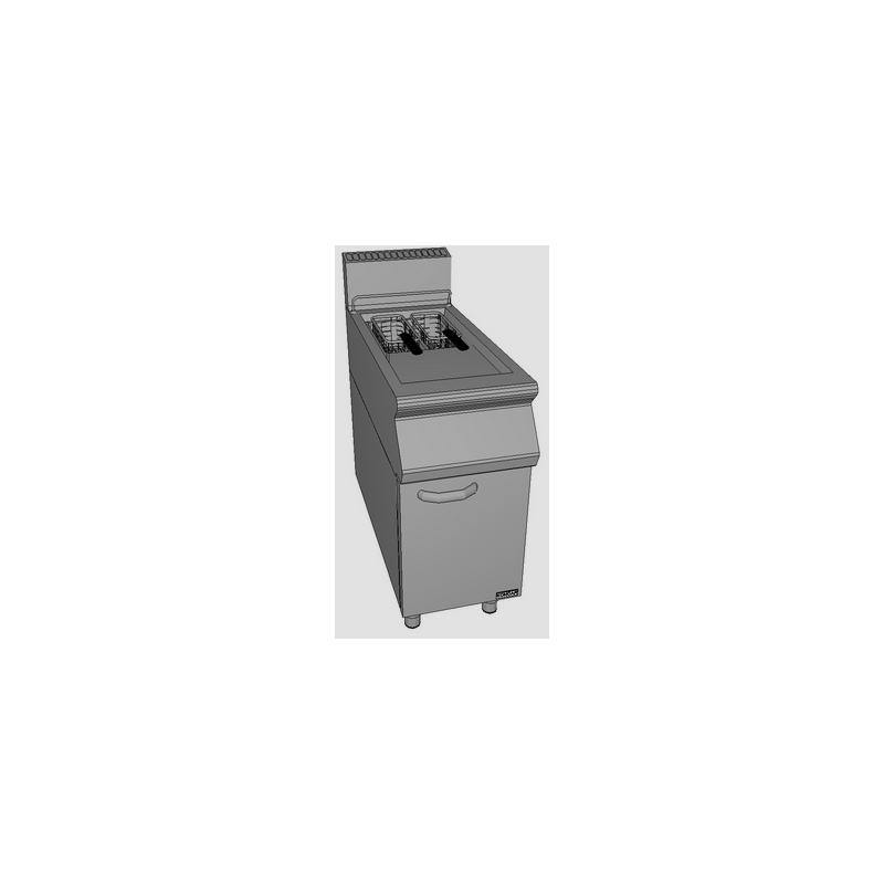 Corp inox cu dulap inchis, dimensiuni 400x930x875mm, putere 2x5.8kW, bazine cu zona rece si zona de decantare, dimensiuni bazin 145x336x260mm, filtru de ulei, flacara de veghe, termocupla, aprindere piezoelectrica, capacitate 2x8litri, dimensiuni cos 135x290x120mm, termostat 100⁰-195⁰C, limitator de temperatura 220⁰C, tara de origine Croatia.