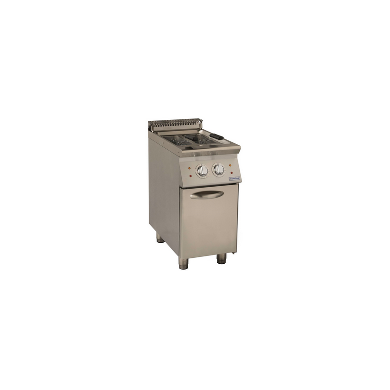 Corp inox cu dulap inchis, dimensiuni 400x930x875mm, putere 2x7kW, bazine cu zona rece si zona de decantare, dimensiuni bazin 145x336x210mm, filtru de ulei, capacitate 2x17 litri, dimensiuni cos 135x290x120mm, termostat 100⁰-195⁰C, limitator de temperatura 220⁰C, alimentare electrica 400v/50hz, tara de origine Croatia.
