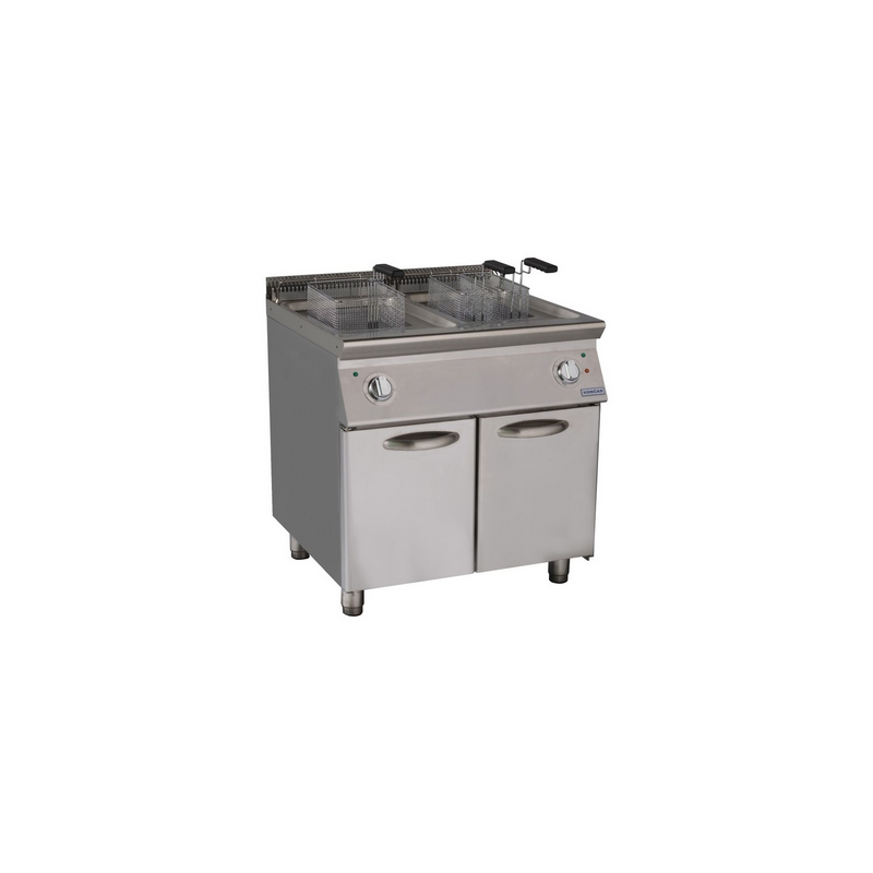 Corp inox cu dulap inchis, dimensiuni 800x930x875mm, putere 2x16.5kW, bazine cu zona rece si zona de decantare, dimensiuni bazin 300x420x245mm, filtru de ulei, capacitate 2x21 litri, dimensiuni cos 280x370x120mm, termostat 100⁰-195⁰C, limitator de temperatura 220⁰C, alimentare electrica 400v/50hz, tara de origine Croatia.