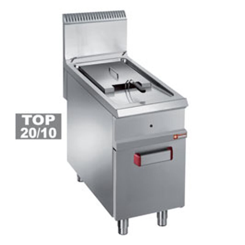 Corp inox, bazin dimensiune 290x400x270mm, zona de decantare, zona rece, flitru din inox cromat, colturi rotunjite pentru o igienizare usoara, capac din inox, capacitate minima 18L, capacitate max 20L, cos cromat cu dimensiune 270x360x140mm, arzatoare orizontale situate in bazin, termostat 90⁰-190⁰C, aprindere piezoelectrica, flacara de veghe, valva de siguranta, dimensiune 400x900x850mm, picioare ajustabile, tara de origine Italia