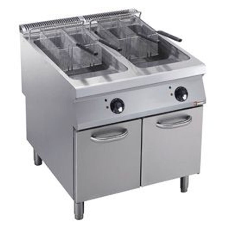 Corp inox, doua bazine din inox in forma de y de dimensiune 340x400x575mm , capacitate minima 21L per bazin, capacitate maxima 23L per bazin, zona rece, zona de decantare, rezistente aflate sub bazin, termostat 105⁰-185⁰C, cos cromat 140x320x150mm, putere 36kW, alimentare 380V, robinet de scurgere, dimensiune 400x900x850mm, picioare ajustabile, tara de origine Italia