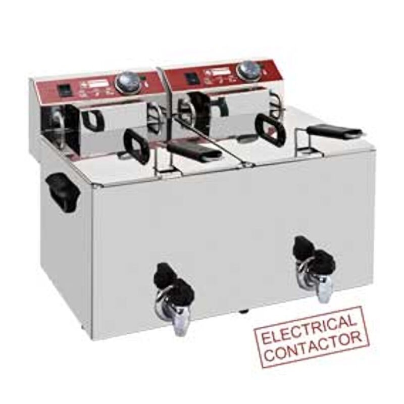 Corp inox, capacitate 2x10l, dimensiune cos 220x190x110mm, robinet de scurgere a grasimii, temperatura maxima 180C, putere 9kW, alimentare 400V/50hz, greutate 13kg, dimensiune 560x450xh320mm, picioare reglabile, tara de origine Belgia