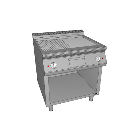 Corp inox cu suport inchis, suprafata de coacere de grosime 16mm, dimensiuni suprafata de coacere 735x525mm, ½ suprafata neteda cromata, ½ suprafata striata cromata, sertar de colectare grasimi inclus(3 litri), termostat 100°C-300°C, alimentare 400V/50Hz, dimensiune 800x730x875mm, putere 10.8kW, picioare ajustabile, tara de origine Croatia.