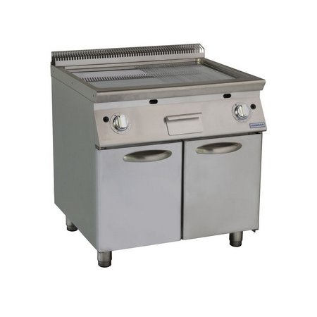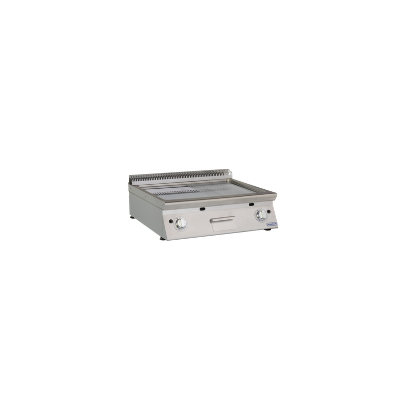 Corp inox, grosime suprafata de coacere 16mm, dimensiuni suprafata de coacere 735x700mm,½ suprafata neteda, ½ suprafata striata, sertar de colectare grasimi inclus(3 litri), termostat 100°C-300°C, alimentare gaz, flacara de veghe, termocupla, valva de siguranta, aprindere piezo-electrica, dimensiune 800x930x280mm, putere 22kW, picioare ajustabile, tara de origine Croatia.