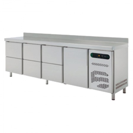 Corp inox, 6 sertare(6 x 1/2), picioare ajustabile, modular, fara agregat, grosime izolatie 50mm, control digital al temperaturii, intrerupator iluminat Start/Stop, garnitura magnetica detasabila pentru curatare usoara, refrigerare cu gaz ecologic R600A, dezghetare automata, putere 29W, capacitate 428L, temperatura cuprinsa intre -2⁰C si 8⁰C, alimentare 230V, dimensiune 1492x700x850, tara de origine Spania.