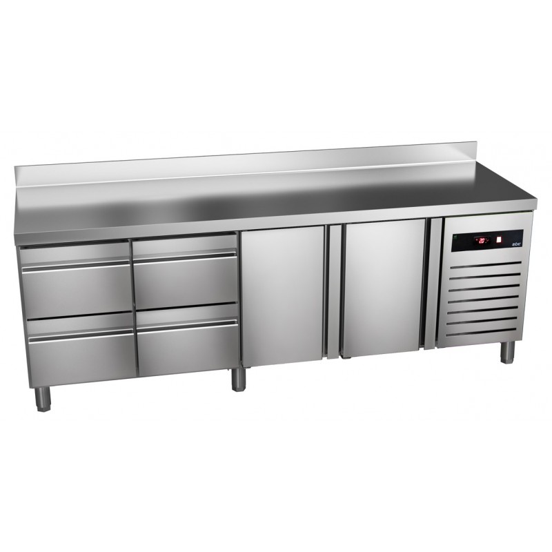 Corp inox, 2 usi, 4 sertare(4 x 1/2), picioare ajustabile, grosime izolatie 50mm, control digital al temperaturii, intrerupator iluminat Start/Stop, garnitura magnetica detasabila pentru curatare usoara, refrigerare cu gaz ecologic R600A, dezghetare automata, putere 224W, consum anual 1096kWh, capacitate 564L, temperatura cuprinsa intre -2⁰C si 8⁰C, alimentare 230V, dimensiune 2017x600x850, tara de origine Spania.