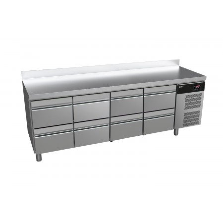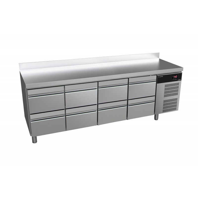 Corp inox, dimensiune 2242 x 700 x 850mm, capacitate 590 litri, putere 0.160kw, tensiune de alimentare: 230 V 1+N – 50 Hz, consum annual 584 kwh,Avantis line,Fabricat special din otel inoxidabil de inalta calitate pentru utilizari profesionale intensive, acest echipament se remarca prin designul robust si finisajele perfecte. Blatul de lucru din otel inoxidabil de 30 mm este prevazut cu un antistrop de 100 mm inaltime, prevenind scurgerile in spatele tejghelei. Izolatia este realizata din poliuretan de inalta densitate, fara CFC, cu grosime de 60 mm, injectata la presiune inalta pentru performanta superioara. Sertarele din otel inoxidabil sunt echipate cu funduri perforate si ghidaje telescopice care permit retragerea completa, optimizand suprafata de lucru, iar alte configuratii de sertare pot fi disponibile la cerere. Usile din otel inoxidabil au manere ergonomice integrate pe toata lungimea, pentru o deschidere practica, prevenind acumularea de praf si murdarie. Panoul de control de mari dimensiuni, sensibil la atingere, permite ajustarea parametrilor, dispune de mod economisire a energiei si sistem de alarma HACCP. panoul frontal pivotant, cu design de ventilare frontala, permite incastrarea echipamentului fara a compromite performanta. Grila de ventilatie frontala mentine sistemul de racire ventilat si eficient. evaporatorul are ventilatie fortata si este acoperit anti-coroziv, iar sistemul inteligent de circulatie a aerului asigura consistenta perfecta a temperaturii prin designul inovator al fluxului de aer. evaporarea apei de dezghetare se face automat, utilizand gazul cald de la compresor, reducand astfel consumul de energie. Picioarele reglabile pe inaltime (130 mm – 200 mm) faciliteaza curatarea, iar optional pot fi adaugate roti. Sinele de ghidare detasabile permit curatarea fara unelte suplimentare, iar gratarele acoperite cu epoxid permit depozitarea diferitelor ambalaje, avand o capacitate maxima de incarcare de 40 kg. Echipamentul ofera 13 pozitii pentru gratare, cu o distanta de 36 mm intre ele, pentru capacitate sporita de incarcare. garnitura magnetica a usilor este detasabila, permitand mentinerea igienei si a proprietatilor de izolare. Interiorul cu margini rotunjite faciliteaza curatarea si reduce locurile de acumulare a murdariei. Acest model este compatibil cu containere de alimentare GN 1/1 si este echipat cu sine compatibile, avand inclus un gratar GN 1/1 pentru fiecare usa. Temperatura de lucru este de 0 ºC la +8 ºC in conditii de climatizare de Clasa V, utilizand gaz refrigerant R600a Hydrocarbon. tara de origine Spania.