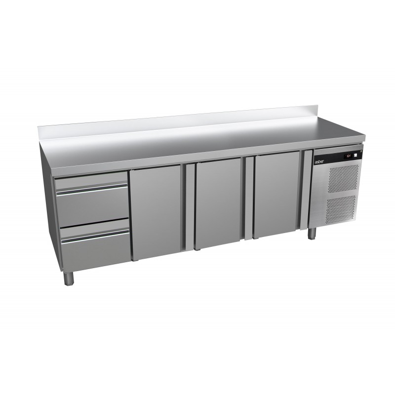 Corp inox, dimensiune 2242 x 700 x 850mm, capacitate 590 litri, putere 0.198kw, tensiune de alimentare: 230 V 1+N – 50 Hz, consum annual 730 kwh, New green line, Fabricat special din otel inoxidabil de inalta calitate pentru aplicatii profesionale intensive, acest echipament este extrem de robust si beneficiaza de finisaje perfecte. Blatul de lucru din otel inoxidabil de 30 mm este injectat si dispune de un antistrop de 100 mm, prevenind scurgerile in spatele tejghelei. Izolatia are o grosime de 60 mm si este realizata din poliuretan de inalta densitate, fara CFC, injectata sub presiune pentru o eficienta maxima. sertarele din otel inoxidabil sunt echipate cu placi perforate in partea de jos si ghidaje telescopice, permitand retragerea completa pentru economisirea spatiului de lucru. Alte configuratii de sertare sunt disponibile la cerere. Usile din otel inoxidabil sunt prevazute cu manere ergonomice, robuste, integrate perfect, ce asigura o deschidere practica si impiedica acumularea prafului si a murdariei. panoul de control digital intuitiv permite reglarea rapida si facila a parametrilor de temperatura. Butonul luminos de pornire-oprire imbunatateste vizibilitatea. Panoul frontal pivotant cu design de ventilare frontala permite incastrarea echipamentului fara a afecta performanta. Grila de ventilatie de pe panoul frontal mentine sistemul de racire ventilat si eficient. Evaporatorul cu ventilatie fortata are un invelis anti-coroziv, iar Sistemul Inteligent de Circulatie a Aerului asigura o consistenta perfecta a temperaturii datorita fluxului de aer innovator. sistemul de evaporare automata a apei de dezghetare utilizeaza gaz fierbinte provenit de la compresor, in locul elementelor de incalzire, reducand astfel consumul de energie. Picioarele din otel inoxidabil sunt reglabile in inaltime, fiecare putand fi ajustat individual intre 130 mm si 200 mm, facilitand curatarea; optional, sunt disponibile roti. Sinele de ghidare detasabile permit operatiuni de curatare mai comode fara unelte suplimentare. Gratarele acoperite cu epoxid, pentru protectie sporita, permit depozitarea diverselor tipuri de ambalaje si suporta o incarcare maxima de pana la 40 kg,dispune de 13 pozitii pentru nivelurile gratarelor, cu o distanta de 36 mm intre ele, pentru o capacitate de incarcare sporita. Garnitura magnetica detasabila permite mentinerea igienei si proprietatile izolante, iar interiorul cu margini rotunjite faciliteaza curatarea si reduce acumularea murdariei. Compatibil cu containere GN 1/1 si echipat cu sine compatibile, avand un gratar GN 1/1 pentru fiecare usa. Temperatura de lucru este de 0 ºC pana la +8 ºC in conditii de climatizare Clasa V. Utilizeaza agent frigorific R600a Hydrocarbon . tara de origine Spania.