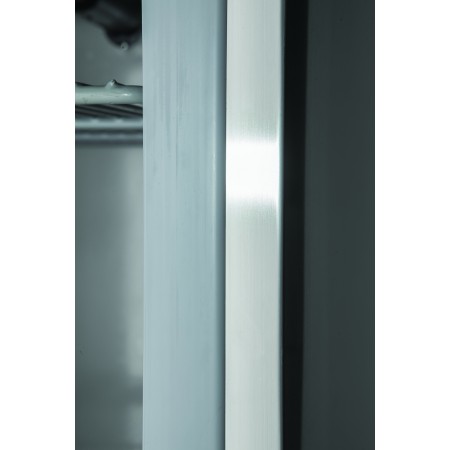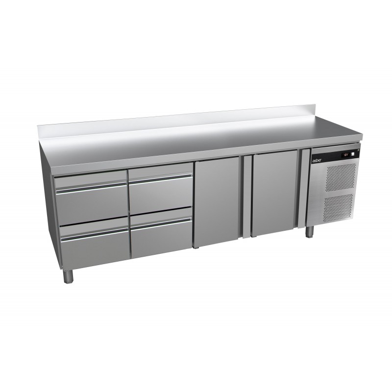 Corp inox, dimensiune 2242 x 700 x 850mm, capacitate 590 litri, putere 0.198kw, tensiune de alimentare: 230 V 1+N – 50 Hz, consum annual 730 kwh, New green line, Fabricat special din otel inoxidabil de inalta calitate pentru aplicatii profesionale intensive, acest echipament este extrem de robust si beneficiaza de finisaje perfecte. Blatul de lucru din otel inoxidabil de 30 mm este injectat si dispune de un antistrop de 100 mm, prevenind scurgerile in spatele tejghelei. Izolatia are o grosime de 60 mm si este realizata din poliuretan de inalta densitate, fara CFC, injectata sub presiune pentru o eficienta maxima. sertarele din otel inoxidabil sunt echipate cu placi perforate in partea de jos si ghidaje telescopice, permitand retragerea completa pentru economisirea spatiului de lucru. Alte configuratii de sertare sunt disponibile la cerere. Usile din otel inoxidabil sunt prevazute cu manere ergonomice, robuste, integrate perfect, ce asigura o deschidere practica si impiedica acumularea prafului si a murdariei. panoul de control digital intuitiv permite reglarea rapida si facila a parametrilor de temperatura. Butonul luminos de pornire-oprire imbunatateste vizibilitatea. Panoul frontal pivotant cu design de ventilare frontala permite incastrarea echipamentului fara a afecta performanta. Grila de ventilatie de pe panoul frontal mentine sistemul de racire ventilat si eficient. Evaporatorul cu ventilatie fortata are un invelis anti-coroziv, iar Sistemul Inteligent de Circulatie a Aerului asigura o consistenta perfecta a temperaturii datorita fluxului de aer innovator. sistemul de evaporare automata a apei de dezghetare utilizeaza gaz fierbinte provenit de la compresor, in locul elementelor de incalzire, reducand astfel consumul de energie. Picioarele din otel inoxidabil sunt reglabile in inaltime, fiecare putand fi ajustat individual intre 130 mm si 200 mm, facilitand curatarea; optional, sunt disponibile roti. Sinele de ghidare detasabile permit operatiuni de curatare mai comode fara unelte suplimentare. Gratarele acoperite cu epoxid, pentru protectie sporita, permit depozitarea diverselor tipuri de ambalaje si suporta o incarcare maxima de pana la 40 kg,dispune de 13 pozitii pentru nivelurile gratarelor, cu o distanta de 36 mm intre ele, pentru o capacitate de incarcare sporita. Garnitura magnetica detasabila permite mentinerea igienei si proprietatile izolante, iar interiorul cu margini rotunjite faciliteaza curatarea si reduce acumularea murdariei. Compatibil cu containere GN 1/1 si echipat cu sine compatibile, avand un gratar GN 1/1 pentru fiecare usa. Temperatura de lucru este de 0 ºC pana la +8 ºC in conditii de climatizare Clasa V. Utilizeaza agent frigorific R600a Hydrocarbon . tara de origine Spania.