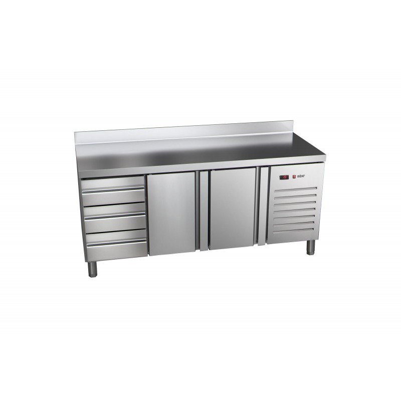 Corp inox, dimensiune 1792 x 700 x 850mm, capacitate 428 litri, putere 0.249 kw, tensiune de alimentare: 230 V 1+N – 50 Hz, consum annual 1119 kwh, Essenizal line,Fabricat special din otel inoxidabil de inalta calitate pentru aplicatii profesionale intensive, acest echipament ofera un design robust si finisaje perfecte. Blatul de lucru greu, din otel inoxidabil, de 50 mm grosime, este prevazut cu un antistrop de 100 mm inaltime pentru a preveni scurgerile in spatele tejghelei. Izolatia din poliuretan de inalta densitate (40 kg/m³), fara CFC, este injectata sub presiune si are o grosime de 50 mm. Sertarele din otel inoxidabil includ placi perforate la baza si ghidaje telescopice care permit o retragere completa pentru a optimiza suprafata de lucru. Alte configuratii de sertare sunt disponibile la cerere. Ghidajele glisante cu inchidere automata si opritorii de deschidere asigura o functionare lina, iar manerul ergonomic, perfect integrat, faciliteaza deschiderea practica a sertarelor. Panoul de control si ventilarea motorului dispun de deschidere pivotanta frontala, oferind acces facil pentru intretinere. Controlul digital intuitiv permite ajustarea rapida si usoara a parametrilor de temperatura, iar butonul luminos de pornire-oprire imbunatateste vizibilitatea functionarii. Grila de ventilare de pe panoul frontal mentine sistemul de racire ventilat si eficient, in timp ce evaporatorul cu ventilatie fortata este protejat impotriva coroziunii. Sistemul inteligent de circulatie a aerului asigura consistenta optima a temperaturii printr-un design inovator al fluxului de aer. Evaporarea automata a apei de dezghetare utilizeaza gazul fierbinte din compresor, eliminand necesitatea elementelor de incalzire si reducand consumul de energie. Picioarele din otel inoxidabil sunt reglabile pe inaltime (130 mm – 200 mm) pentru a facilita curatarea, iar echipamentul poate fi echipat optional cu roti. Sinele de ghidare si ghidajele glisante detasabile permit curatarea convenabila fara unelte suplimentare. Gratarele acoperite cu epoxid permit depozitarea diverselor tipuri de ambalaje si suporta o incarcare maxima de pana la 40 kg. Echipamentul ofera 6 pozitii pentru gratare, cu o distanta de 70 mm intre ele, pentru o capacitate de incarcare extinsa. Garnitura magnetica detasabila a usilor si sertarelor asigura igiena maxima si mentine proprietatile izolante. Interiorul cu margini rotunjite faciliteaza curatarea si reduce capcanele de murdarie.Compatibil cu containere alimentare GN 1/1, echipamentul include un gratar GN 1/1 pentru fiecare usa. Agentul frigorific utilizat este R290 Hydrocarbon (HC). Temperatura de functionare este de 0 ºC pana la +8 ºC in conditii de climatizare Clasa IV, tara de origine Spania.