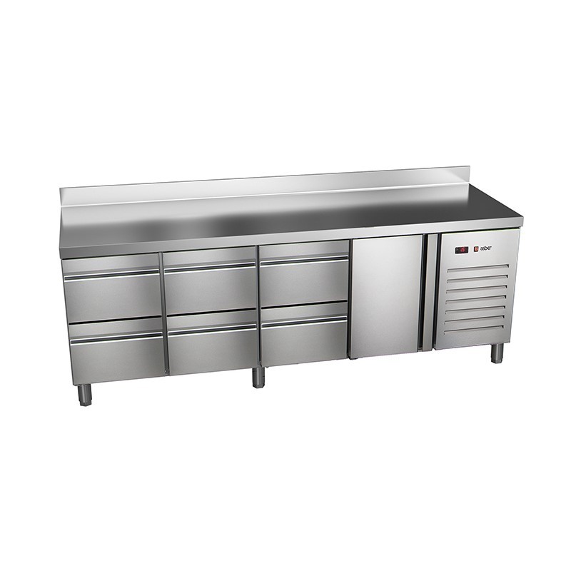 Corp inox, dimensiune 2242 x 700 x 850mm, capacitate 581 litri, putere 0.332 kw, tensiune de alimentare: 230 V 1+N – 50 Hz, consum annual 1746 kwh, Essenizal line ,Fabricat special din otel inoxidabil de inalta calitate pentru aplicatii profesionale intensive, acest echipament ofera un design robust si finisaje perfecte. Blatul de lucru greu, din otel inoxidabil, de 50 mm grosime, este prevazut cu un antistrop de 100 mm inaltime pentru a preveni scurgerile in spatele tejghelei. Izolatia din poliuretan de inalta densitate (40 kg/m³), fara CFC, este injectata sub presiune si are o grosime de 50 mm. Sertarele din otel inoxidabil includ placi perforate la baza si ghidaje telescopice care permit o retragere completa pentru a optimiza suprafata de lucru. Alte configuratii de sertare sunt disponibile la cerere. Ghidajele glisante cu inchidere automata si opritorii de deschidere asigura o functionare lina, iar manerul ergonomic, perfect integrat, faciliteaza deschiderea practica a sertarelor. Panoul de control si ventilarea motorului dispun de deschidere pivotanta frontala, oferind acces facil pentru intretinere. Controlul digital intuitiv permite ajustarea rapida si usoara a parametrilor de temperatura, iar butonul luminos de pornire-oprire imbunatateste vizibilitatea functionarii. Grila de ventilare de pe panoul frontal mentine sistemul de racire ventilat si eficient, in timp ce evaporatorul cu ventilatie fortata este protejat impotriva coroziunii. Sistemul inteligent de circulatie a aerului asigura consistenta optima a temperaturii printr-un design inovator al fluxului de aer. Evaporarea automata a apei de dezghetare utilizeaza gazul fierbinte din compresor, eliminand necesitatea elementelor de incalzire si reducand consumul de energie. Picioarele din otel inoxidabil sunt reglabile pe inaltime (130 mm – 200 mm) pentru a facilita curatarea, iar echipamentul poate fi echipat optional cu roti. Sinele de ghidare si ghidajele glisante detasabile permit curatarea convenabila fara unelte suplimentare. Gratarele acoperite cu epoxid permit depozitarea diverselor tipuri de ambalaje si suporta o incarcare maxima de pana la 40 kg. Echipamentul ofera 6 pozitii pentru gratare, cu o distanta de 70 mm intre ele, pentru o capacitate de incarcare extinsa. Garnitura magnetica detasabila a usilor si sertarelor asigura igiena maxima si mentine proprietatile izolante. Interiorul cu margini rotunjite faciliteaza curatarea si reduce capcanele de murdarie.Compatibil cu containere alimentare GN 1/1, echipamentul include un gratar GN 1/1 pentru fiecare usa. Agentul frigorific utilizat este R290 Hydrocarbon (HC). Temperatura de functionare este de 0 ºC pana la +8 ºC in conditii de climatizare Clasa IV, tara de origine Spania.
