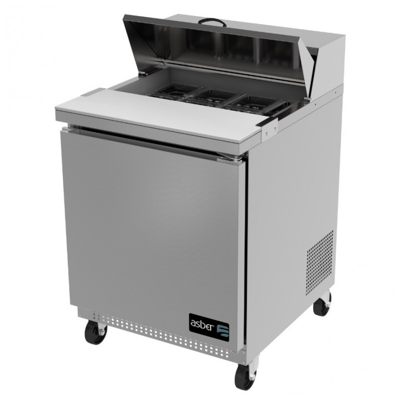 Corp inox, o usa,refrigerent R-104a, blat taiat pentru tavi GN 6 X 1/6 + 2 X 1/9 de 10cm adancime, capac pentru acoperirea tavilor GN,blat 25 cm pentru taiere, temperatura cuprinsa intre 2⁰si 8⁰, curent 230V, dimensiune 685x762x1153mm, tara de origine Spania