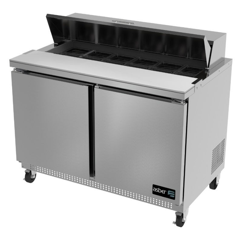 Corp inox, 2 usi, refrigerent R-104a, blat taiat pentru tavi GN 12 X 1/6 de 10cm adancime, capac pentru acoperirea tavilor GN, blat 25 cm pentru taiere, temperatura cuprinsa intre 2⁰si 8⁰, curent 230V, dimensiune 1524x762x1153mm, tara de origine Spania
