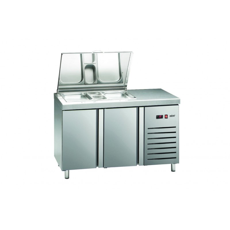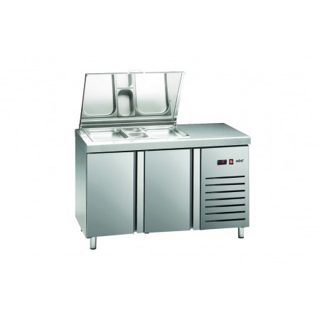 Corp inox, dimensiune 1342 x 700 x 900 mm, capacitate 274 litri, putere 0.223 kw, tensiune de alimentare: 230 V 1+N – 50 Hz, Refrigerated work stations, Fabricat special din otel inoxidabil de inalta calitate pentru aplicatii profesionale intensive, acest echipament se remarca printr-un design robust si finisaje perfecte. Ideal pentru utilizare ca statie compacta pentru prepararea salatelor sau sandvisurilor. Suprafata de lucru Saladette din otel inoxidabil, cu grosimea de 50 mm, este conceputa pentru a gazdui recipiente GN (neincluse), care sunt racite prin contact direct cu partea inferioara a mesei. Include un capac nocturn oscilant din otel inoxidabil, cu pozitie de deschidere fixa la 90°. Izolatia este realizata din poliuretan de inalta densitate (40 kg/m³), fara CFC, cu grosimea de 50 mm, injectata sub presiune inalta. Usile din otel inoxidabil sunt prevazute cu manere ergonomice, integrate pe toata lungimea, robuste si usor de utilizat, care impiedica acumularea de praf si murdarie. Usile oscilante cu returnare automata asigura o inchidere perfecta, minimizand cresterea temperaturii. Usile au o pozitie de repaus la 120° si se inchid automat la mai putin de 90°. Balamalele sunt reversibile, permitand adaptarea echipamentului pe loc. Panoul de control si ventilatia motorului sunt prevazute cu deschidere frontala pivotanta. Controlul digital intuitiv permite ajustarea rapida si usoara a parametrilor de temperatura. Butonul luminos de pornire-oprire asigura o utilizare simpla. Evaporatorul cu flux fortat este protejat de un capac anti-coroziv. Sistemul inteligent de circulatie a aerului mentine o temperatura constanta datorita designului inovativ al fluxului de aer. Apa rezultata din dezghetare se evapora automat, utilizand gazul cald provenit de la compresor, reducand astfel consumul de energie. Picioarele din otel inoxidabil sunt reglabile pe inaltime (130 mm – 200 mm), permitand o curatare convenabila. Rotile sunt disponibile optional. Ghidajele detasabile faciliteaza curatarea fara a necesita unelte suplimentare. Grilele epoxidate permit stocarea diferitelor tipuri de ambalaje si au o capacitate maxima de incarcare de 40 kg. Exista 6 pozitii pentru grile, cu o distanta de 70 mm intre ele, pentru o capacitate sporita de incarcare. Garnitura magnetica detasabila a usilor asigura igiena maxima si mentine proprietatile izolatoare. Interiorul cu margini rotunjite faciliteaza curatarea si reduce capcanele de murdarie. Este compatibil cu recipiente alimentare GN 1/1 si include ghidaje compatibile. Echipamentul este livrat cu o grila GN 1/1 pentru fiecare usa. Gazul refrigerant utilizat este R290 (HC). Temperatura de functionare este cuprinsa intre 0 ºC si +8 ºC in conditii climatice de clasa IV. tara de origine Spania.