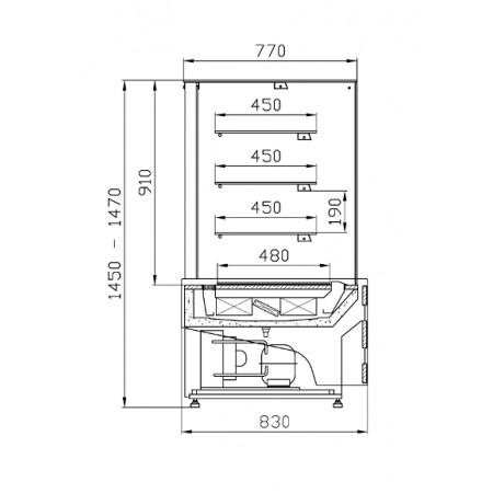 Corp metal vopsit electrostatic, sistem de racire dinamic, afisaj digital, usi glisante din sticla dubla, iluminare fluorescenta, unitate de condensare integrala, evaporarea automata a apei, dimensiune 950x830x1470mm, temperatura de lucru 5-15C la o temperatura ambientala 25C si umiditate 60%, agent frigorific R507, capacitate 300l, putere 800W, consum electric 11.5 kWh/zi, alimentare 230V/50hz, greutate 180kg, incarcare maxima a raftului 10kg/m, tara de origine Polonia